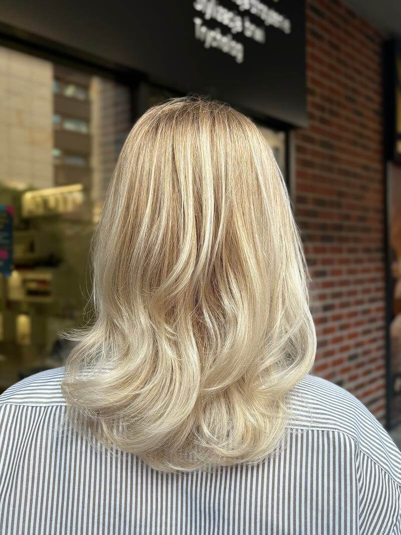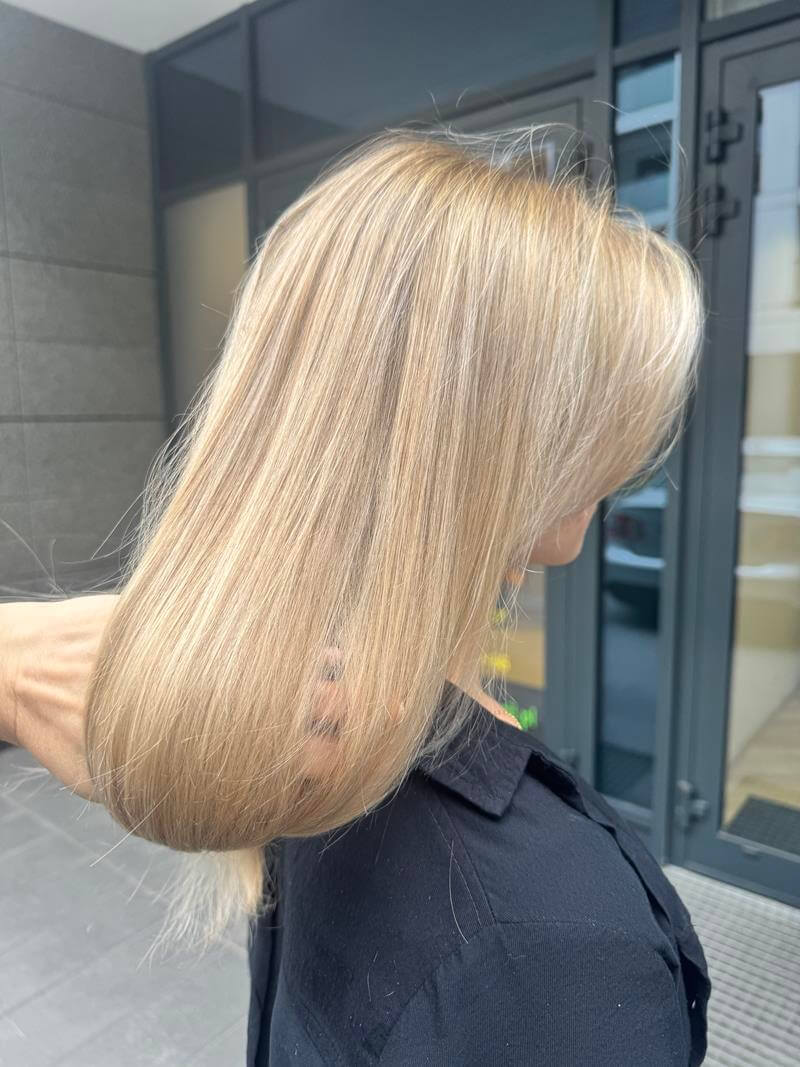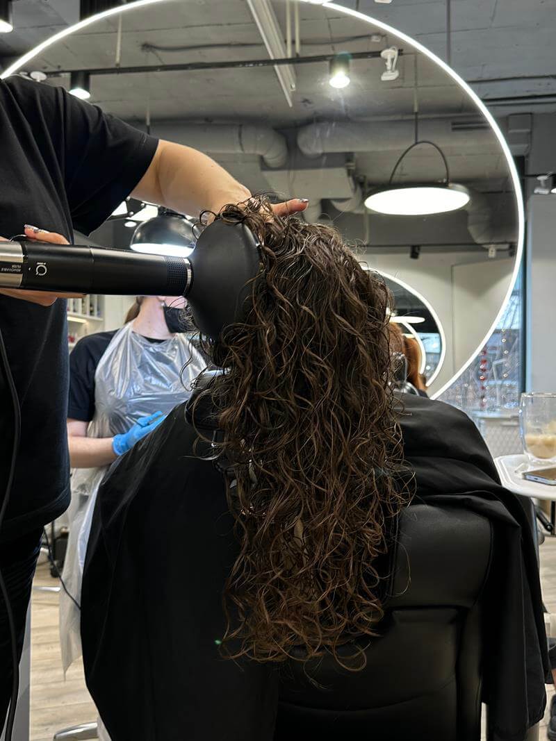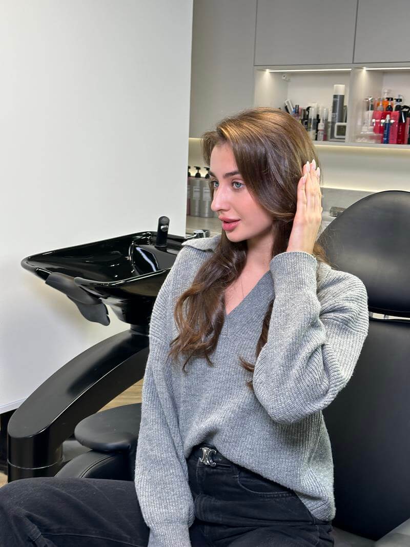 Hair wash with professional products, application of heat protection, and blow-dry styling with a brush while maintaining the integrity of hair extensions. Used cosmetics: Shampoo according to scalp type, mask (depending on hair structure), conditioner, heat-protection spray.