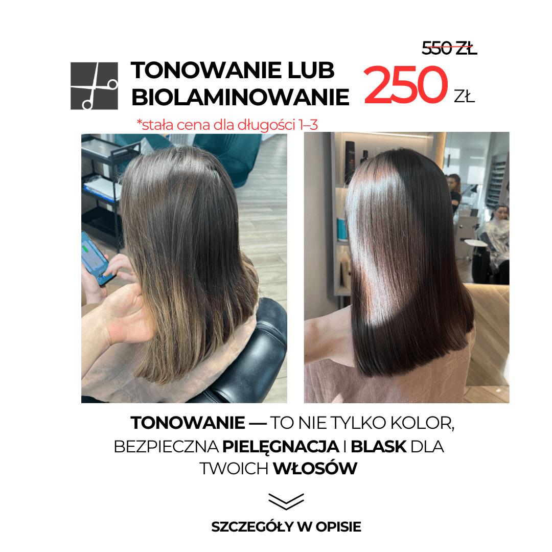 Tonowanie lub biolaminowanie włosów w specjalnej cenie. Ponad 40% zniżki! Aby zarezerwować, zadzwoń lub napisz do administratora.